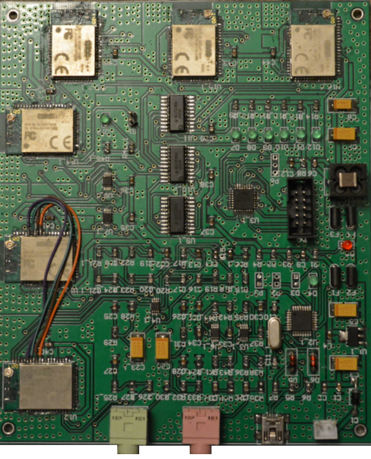mBox has 6 class 1 Bluetooth radios, each capable of receiving and sending audio. It also has auxiliary input and output ports, and WiFi.