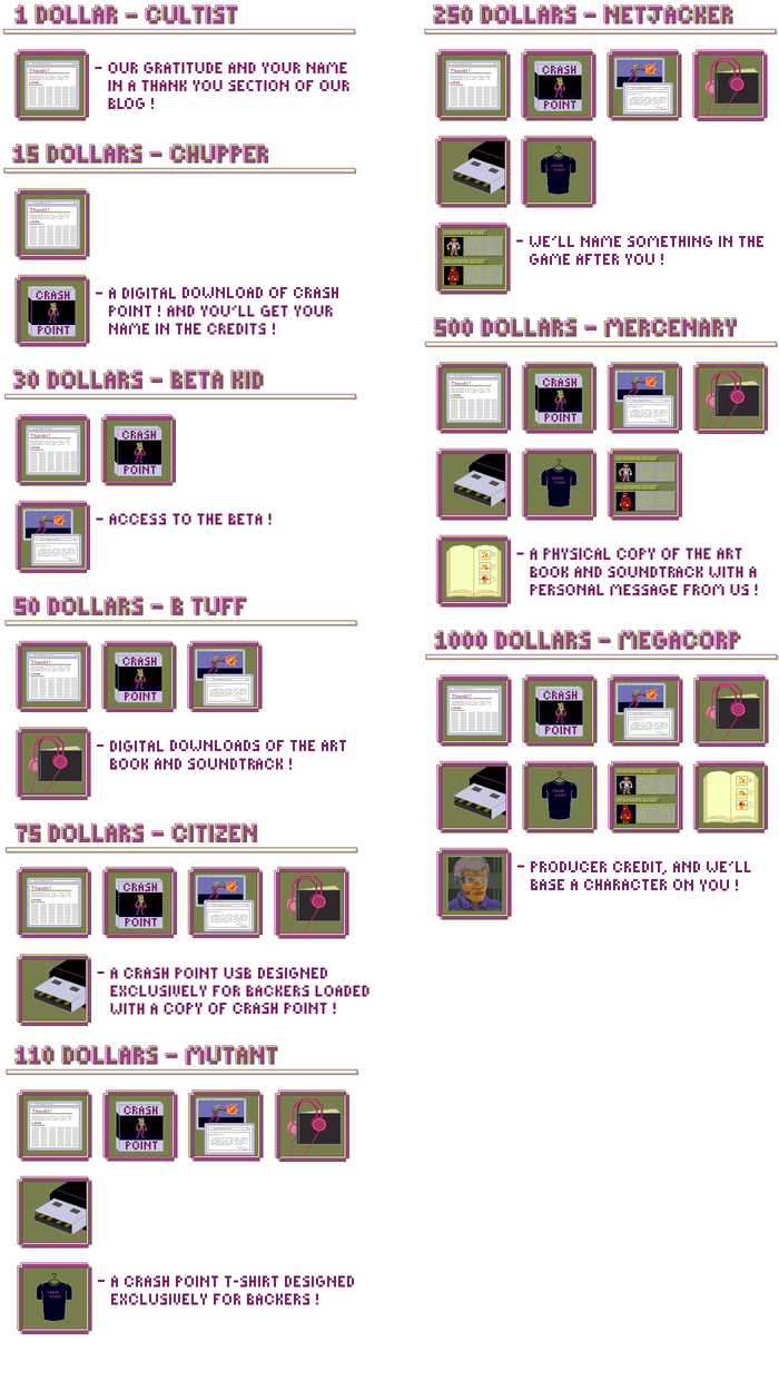 Megacorp- You get all the goodies plus we'll credit you as a producer once the game is released! Also join the world of CRASH POINT as a full fledged, customized NPC. We'll create a character based on your input!