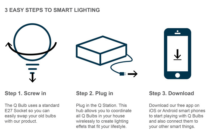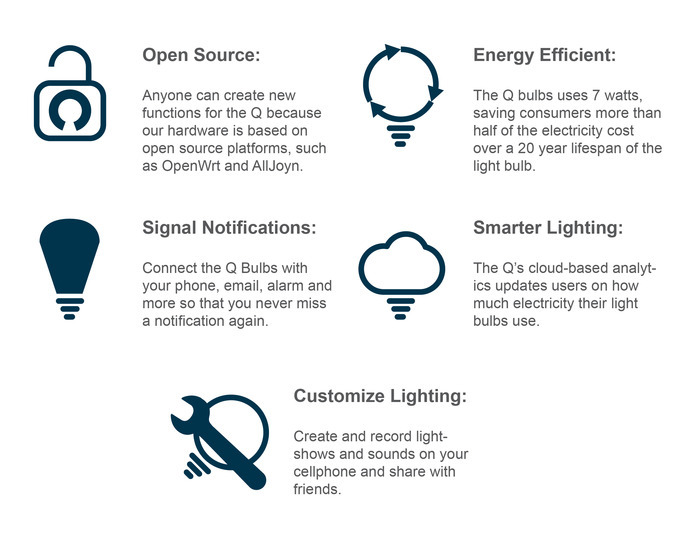 Our energy-efficient and affordable LED light bulbs connect to the world through the Q Station router, allowing you to both create a Q (queue) of music and send lighting Qs (cues) from the same smartphone app.