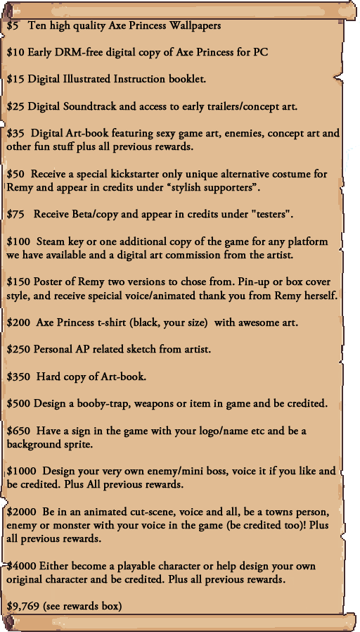 On the off chance a generous, inebriated millionaire or doctor stumbles onto this kickstarter you get: All rewards, become a producer for Axe Princess, have input on levels games and monsters, receive early demo of game and lifetime free access to any and all Axe Princess sequels or content. Furthermore, our team will see to it we get you anything else that is reasonable and within our power related to Axe Princess.