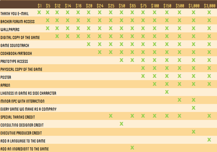 SOUS CHEF- Everything in the $100 level, plus you get to design a minor NPC character that the player can interact with in the game.