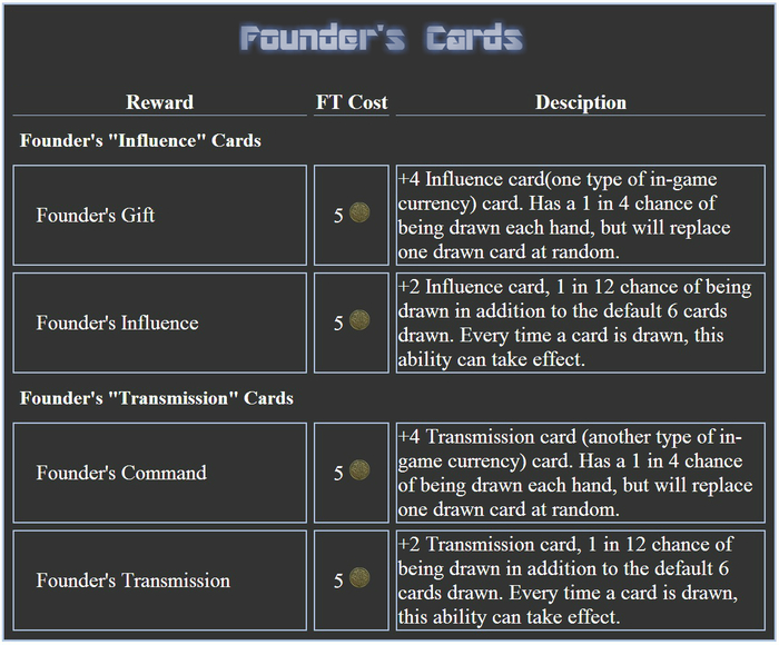 Founder’s Cards: The Galactic Council recognizes that it owes its existence to your contribution and sends you special reward packages in every game you play. Each of these rewards grants a rare and powerful card that will show up during your games. Note that each card can only be claimed once. More FT specific cards may be added later depending on requests from the community.