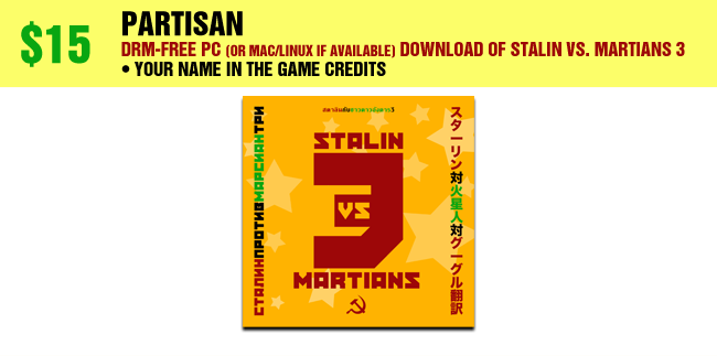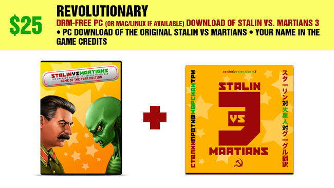 DRM-free PC (or Mac/Linux if available) download of Stalin vs. Martians 3 • PC download of the original Stalin vs. Martians • Your name in the game credits