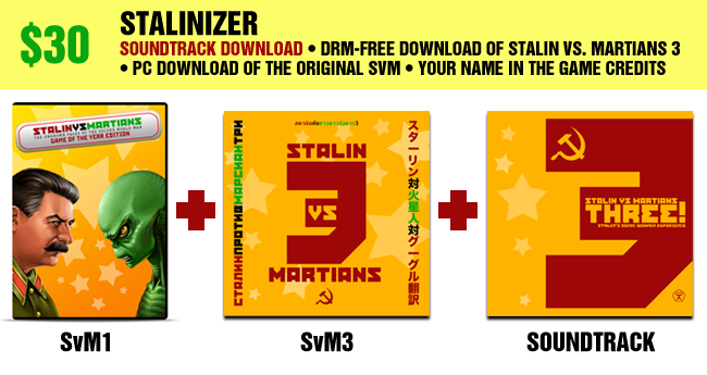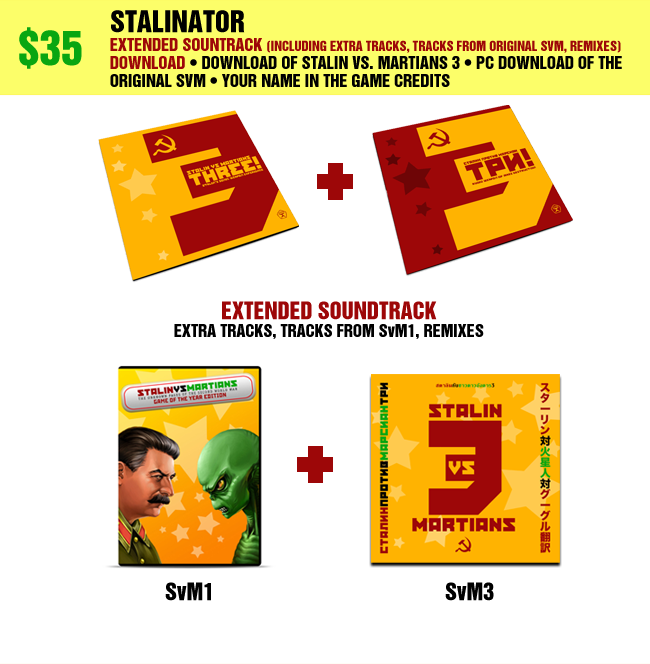 Extended Soundtrack (including extra tracks, tracks from original SvM, wild remixes) download • DRM-free PC download of Stalin vs. Martians 3 • PC download of the original Stalin vs. Martians • Your name in the game credits