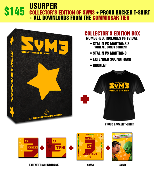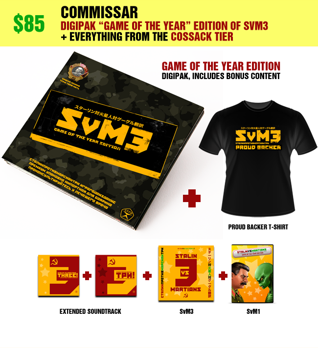 Digipak “Game of the Year Edition” of Stalin vs. Martians 3 • Proud Backer T-Shirt • Bonus content, including Stalin riding a chicken and more • Extended Soundtrack (including extra tracks, tracks from original SvM, wild remixes) download • DRM-free PC download of Stalin vs. Martians 3 • PC download of the original Stalin vs. Martians • Your name in the game credits