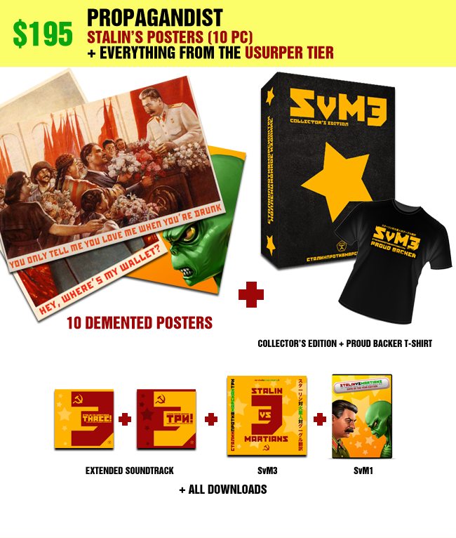 Stalin posters (10 pc) • Collector’s Edition (numbered, includes SvM3+SvM+Extended Soundtrack+Booklet) • Proud Backer T-Shirt • Bonus content, including Stalin riding a chicken and more • Extended Soundtrack (including extra tracks, tracks from original SvM, wild remixes) download • DRM-free PC download of Stalin vs. Martians 3 • PC download of the original Stalin vs. Martians • Your name in the game credits