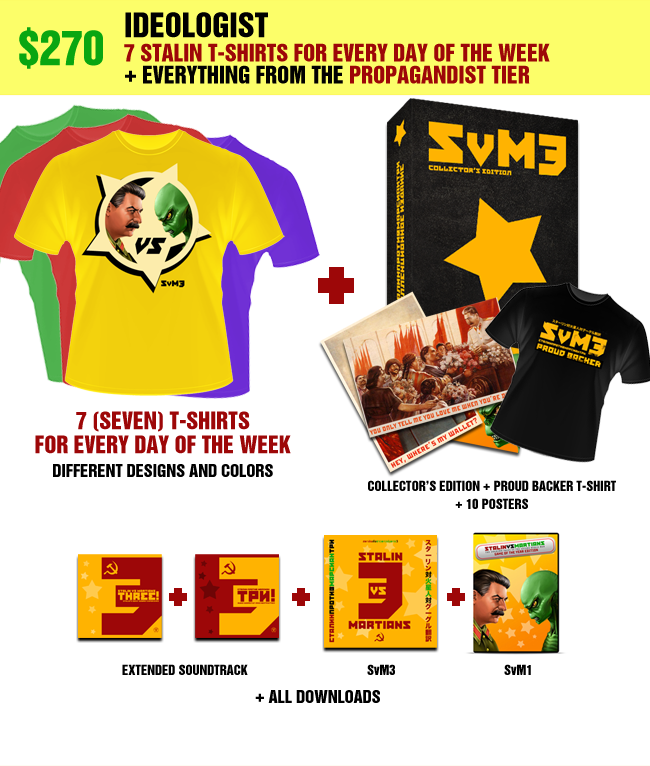 7 Stalin t-shirts for every day of the week • Stalin posters (10 pc) • Collector’s Edition (numbered, includes SvM3+SvM+Extended Soundtrack+Booklet) • Proud Backer T-Shirt • Bonus content, including Stalin riding a chicken and more • Extended Soundtrack (including extra tracks, tracks from original SvM, wild remixes) download • DRM-free PC download of Stalin vs. Martians 3 • PC download of the original Stalin vs. Martians • Your name in the game credits
