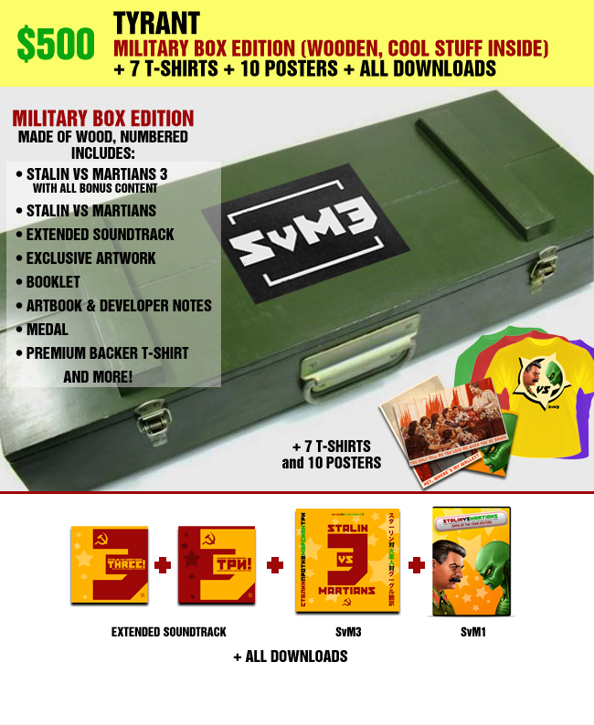 Wooden “Military Box” Edition: Numbered, includes SvM3+SvM+Extended Soundtrack, all with exclusive artwork, bonus content, booklet, ARTBOOK & DEVELOPER NOTES, a MEDAL, exclusive PREMIUM BACKER T-SHIRT and more • 7 Stalin t-shirts for every day of the week • Extended Soundtrack download • DRM-free PC download of Stalin vs. Martians 3 • PC download of the original Stalin vs Martians • Your name in the game credits