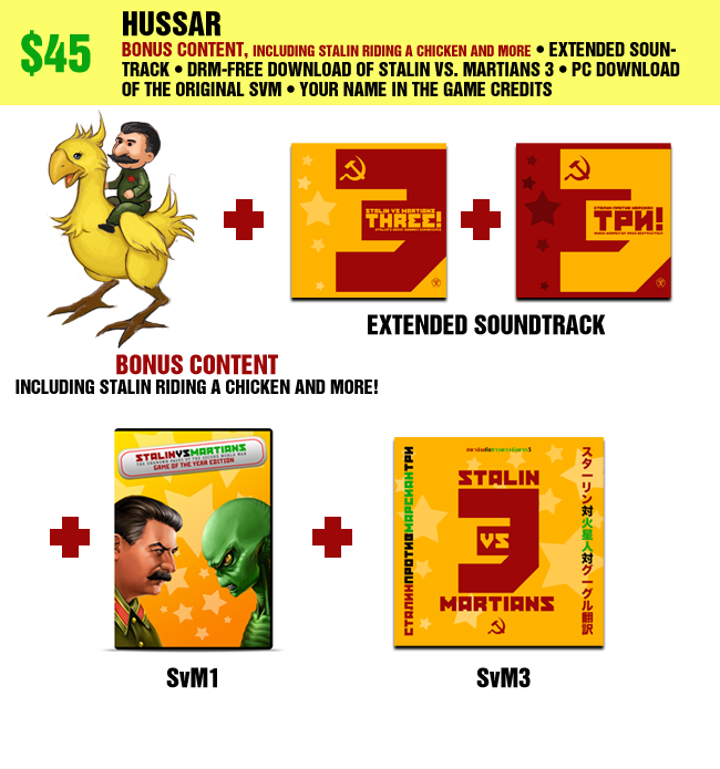 Bonus content, including Stalin riding a chicken and more • Extended Soundtrack (including extra tracks, tracks from original SvM, wild remixes) download • DRM-free PC download of Stalin vs. Martians 3 • PC download of the original Stalin vs. Martians • Your name in the game credits