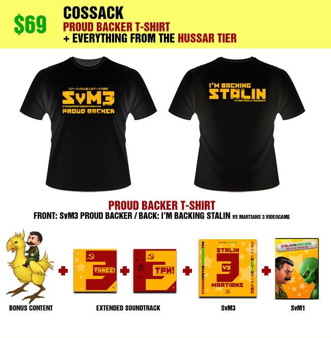 Proud Backer T-Shirt • Bonus content, including Stalin riding a chicken and more • Extended Soundtrack (including extra tracks, tracks from original SvM, wild remixes) download • DRM-free PC download of Stalin vs. Martians 3 • PC download of the original Stalin vs. Martians • Your name in the game credits