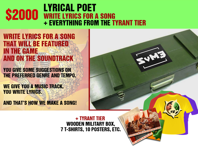 WRITE LYRICS FOR ONE OF THE SONGS ON THE SvM3 SOUNDTRACK (you suggest genre and tempo, we send you the music track, you write the track and that's how we make a song) + TYRANT TIER (Military Box Edition + stuff)