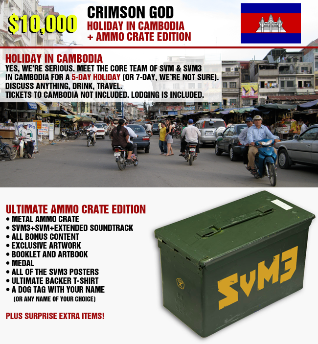 HOLIDAY IN CAMBODIA.Yes, we’re serious. Meet the core team of SvM & SvM3 in Cambodia for a 5-day holiday. Discuss anything, drink, travel. Tickets to Cambodia not included. Lodging is included. • ULTIMATE AMMO CRATE EDITION. Metal ammo crate, SvM3+SvM+Extended Soundtrack+Bonus Content. Exclusive artwork. Booklet and artbook. An ORDER. All of the SvM3 posters. Exclusive ultimate backer t-shirt. A DOG TAG with your name (or any name of your choice). Plus surprise extra items.