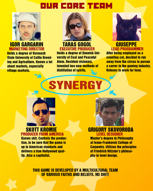 You also can be pretty sure that we’re not going to, you know, ask for the money on Kickstarter and then go and ask money from the publisher. Like some of the people do. It is quite obvious, that games like Stalin vs. Martians are essentially “people’s games”, you can’t get a funding for THAT from an average publisher. Only the audience can keep this indie kitsch madness alive (and even expand it to feature films and FMV-shooters).