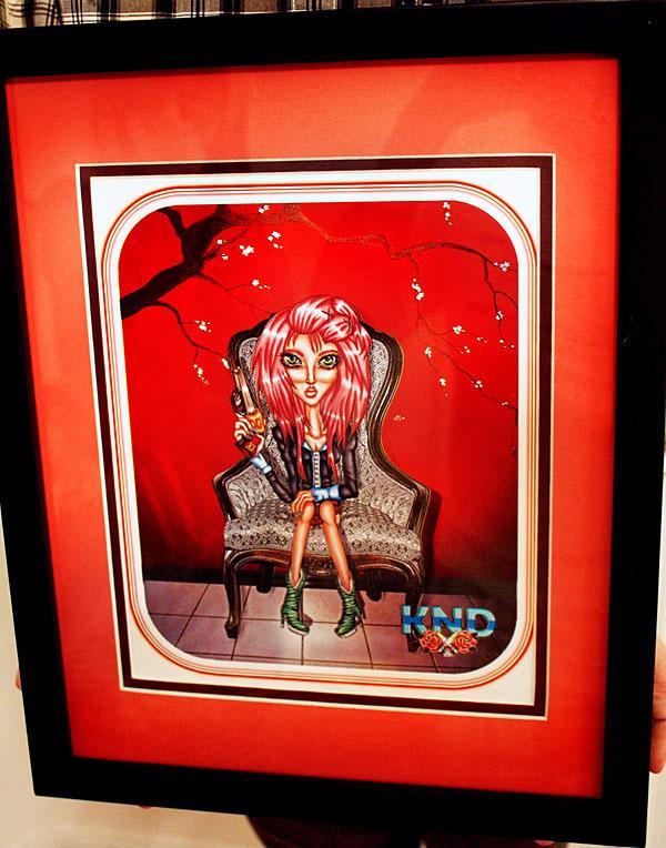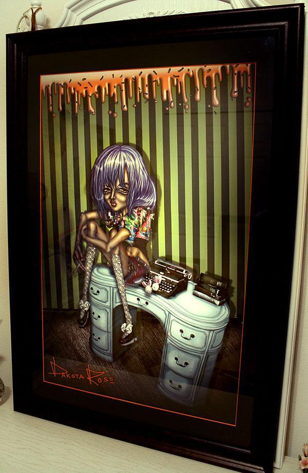This mysterious badass chick has a bone to pick. This blood red rosey piece holds thousands of detail and decadent depth. One of a kind work by artist Dakota Rose and Designer Kiki Mimieux. Dakota Rose creates very detailed pieces by hand, her work is polished and some art pieces take up to a month to master. The Two sisters' minds intertwined create a new world of eerie haute edge. This piece will brighten up, add multidimensional colors and depth/detail to any room, office, bathroom, shop, ANYWHERE. A great conversational piece that will let anyone know who sees this gunho' chick in your space will KNOW you have vivacious taste. Black framed with salmon pink and plum professional fashion matting.