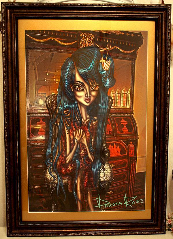 This mysterious badass chick has a bone to pick. This blood red rosey piece holds thousands of detail and decadent depth. One of a kind work by artist Dakota Rose and Designer Kiki Mimieux. Dakota Rose creates very detailed pieces by hand, her work is polished and some art pieces take up to a month to master. The Two sisters' minds intertwined create a new world of eerie haute edge. This piece will brighten up, add multidimensional colors and depth/detail to any room, office, bathroom, shop, ANYWHERE. A great conversational piece that will let anyone know who sees this gunho' chick in your space will KNOW you have vivacious taste. Black framed with salmon pink and plum professional fashion matting.Estimated delivery: -
