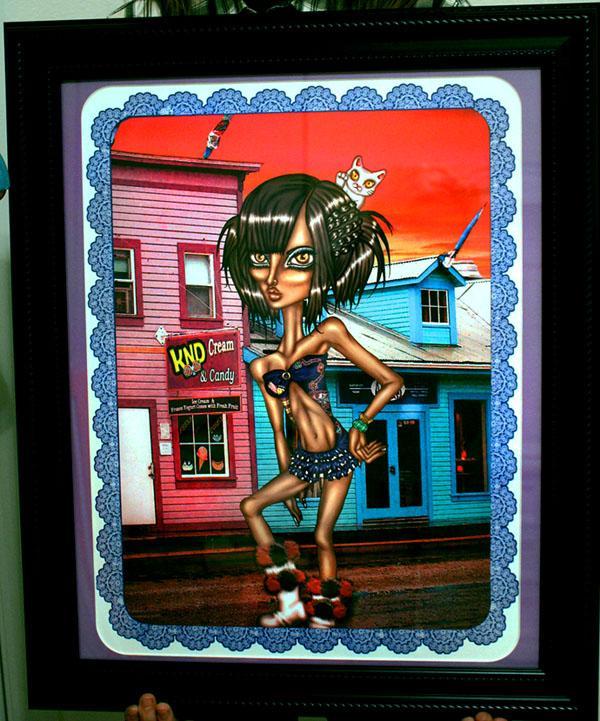 This tan snow bunny will always make sure it's sunny. This aurora borealis fluorescent piece holds thousands of detail and decadent depth. One of a kind work by artist Dakota Rose and Designer Kiki Mimieux. Dakota Rose creates very detailed pieces by hand, her work is polished and some art pieces take up to a month to master. The Two sisters' minds intertwined create a new world of eerie haute edge. This piece will brighten up, add multidimensional colors and depth/detail to any room, office, bathroom, shop, ANYWHERE. A great conversational piece that will let anyone know who sees this lucky cat bombshell in your space will KNOW you have vivacious taste. Black braided framed with a vintage blue lace boarder and lilac professional fashion matting.