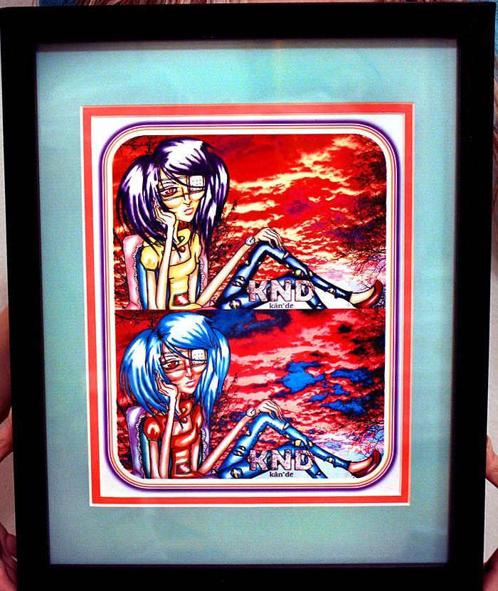 kawaii japanese kabuki doll key chain, special thanks on website , your name in a thank you video, 2 EP downloads: IDORU and RAGE KITTEN XIII, a personal adorable hand written thank you letter/package (you'll feel as if you are receiving a present on a holiday! that's how neat we make them), a limited edition Vladimere or Edgar t-shirt, Vladimere or Edgar sweatshirt, vintage limited print t-shirt, eyeball bow hair accessory, one of Dakota's exclusive design/graphic (she will design one for this special occasion) on a card signed by the both of us girls! A skype chat, Ichat session, or Stickam session with Dakota and I. We can talk, create new music, creative input, or just hang out AND one of a kind KND Socorro's Eyepatch Piece 14.5" x 12" piece of art by Dakota (KotaKoti): This kill thrill star's skills has gotten her far. This aurora borealis fluorescent sunset piece holds thousands of detail and decadent depth. One of a kind work by artist Dakota Rose and Designer Kiki Mimieux. Dakota Rose creates very detailed pieces by hand, her work is polished and some art pieces take up to a month to master. The Two sisters' minds intertwined create a new world of eerie haute edge. This piece will brighten up, add multidimensional colors and depth/detail to any room, office, bathroom, shop, ANYWHERE. A great conversational piece that will let anyone know who sees this explosion of color and poise detail in your space will KNOW you have vivacious taste. Black smoke framed with a neon turquoise and salmon pink professional fashion matting.