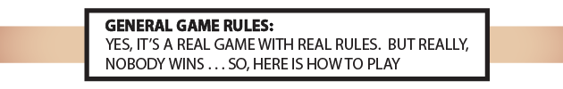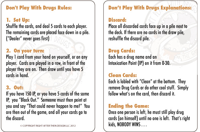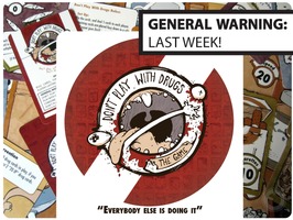 "Do not play Don't Play With Drugs: The Game while operating heavy machinery, driving, or riding a bike; playing DPWD:TG while sleeping isn't possible; do not ingest or smoke DPWD:TG cards, I'm going to take a stab in the dark here and say that's not a good idea . . . it's just weird; do not swim or engage in aquatic sports while playing DPWD:TD, it will ruin the damn cards; irritable bowels, erectile disfunction, hair loss, trouble sleeping, and narcolepsy have not been show to be side effects of playing DPWD:TG, but now you're probably worried that I even took the time to bring it up; don't play with drugs, play with Don't Play With Drugs: The Game . . . Everybody else is doing it."