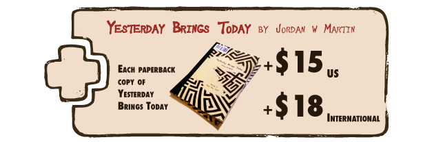 Yesterday Brings Today is an illustrated short story by Jordan W Martin, that was funded through Kickstarter. It is two perspectives that form one story. The physical book itself has no back cover, it is read from both directions toward the center. The dedication reads, "For those that have left, and those of us left behind."