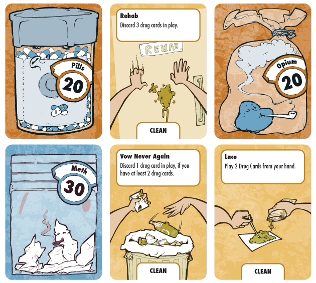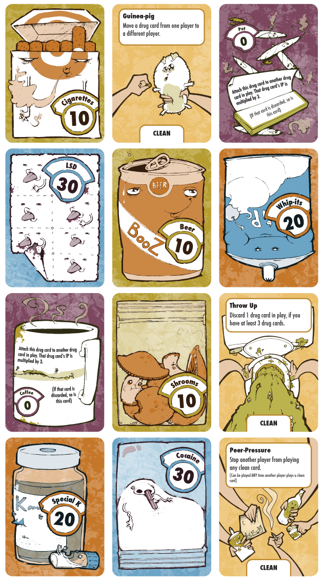 One day, Jordan made a joke about a horrible drug PSA that was aimed at children, saying, "It should just be a game where you try to play drug cards on other players and clean cards to try and clean yourself . . . I could actually make that." Jordan mentioned this "joke" to his cousin/ business partner, Derek, who said, "Sounds like a finished game to me." So, they fleshed it out and play tested it. Jordan and his wife Ali did awesome illustrations for the 1st edition, and then Jordan and Derek did a short run of 300 for the 1st edition. But that just wasn't enough. The 1st edition didn't even have a nice box and 300 isn't enough to get it into stores, or get everybody hooked on Don't Play With Drugs: The Game. So, they decided to run a Kickstarter, this Kickstarter in fact, to raise the money to make an amazing Don't Play With Drugs: The Game 2nd Edition. The first run was a guinea-pig, now we want to supply you with a higher quality product.