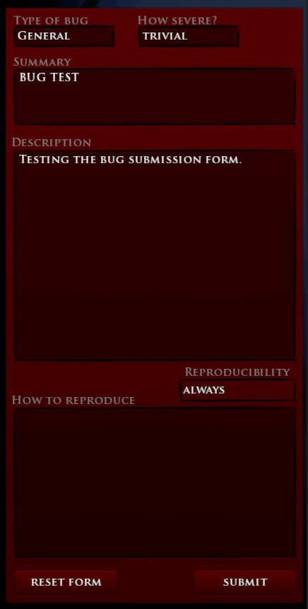 8.) At any time during game play you experience a bug or have a suggestion that would improve Roam, you may click the submission form button and enter feedback. This will submit a new bug to our tracker. Anyone with an alpha account will also automatically have a bug tracking account made. The link to the bug tracker will be available on alpha launch.