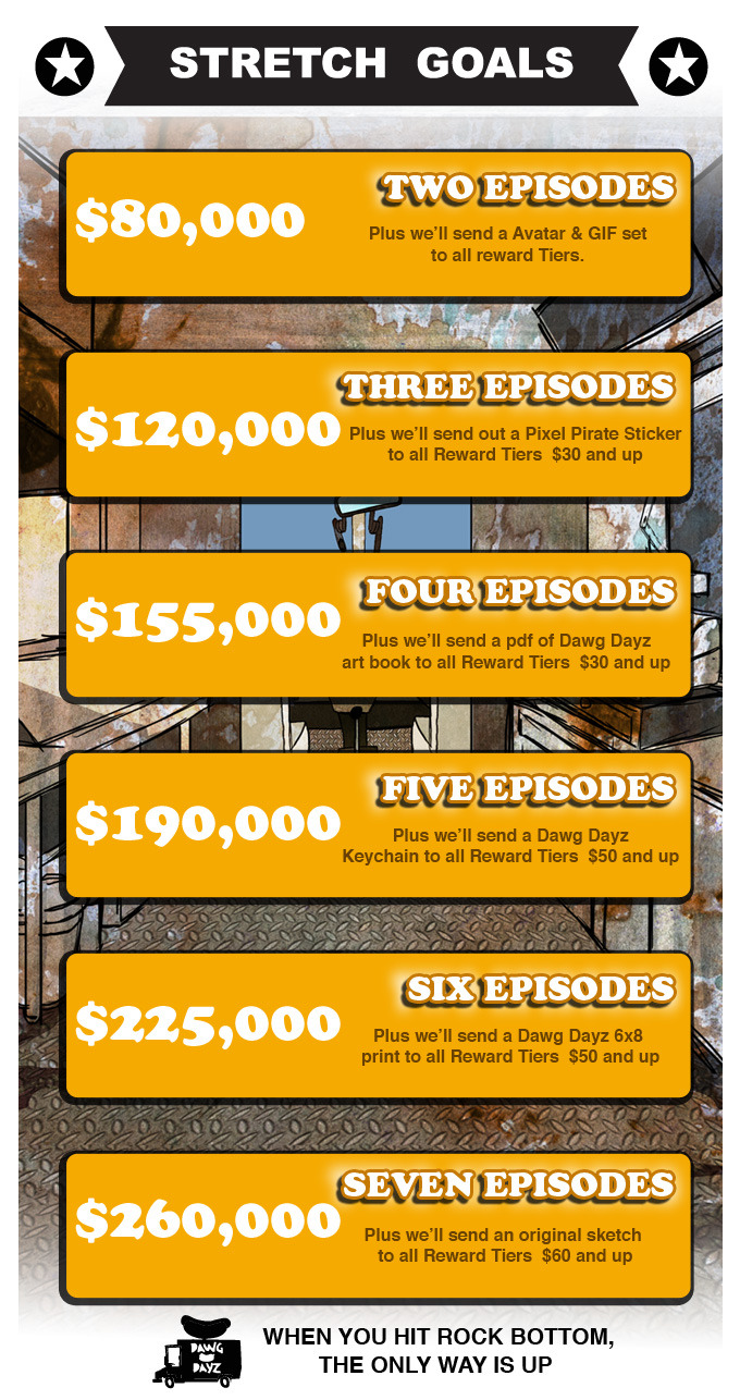 +Dawg Dayz T-Shirt + DVD of all episodes created with bonus footage + Digital Downloadable Episodes + Signed Poster + PDF Storyboards.