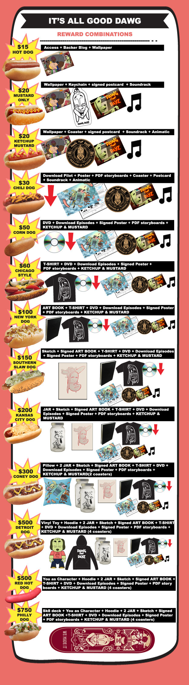 Skate deck + You as a Dawg Dayz character (framed) + Dawg Dayz hoody +2 Character Jars + Original Sketch + Signed Art of Dawg Dayz booklet + Dawg Dayz T-Shirt + DVD of all episodes created with bonus footage + Digital Downloadable Episodes + Signed Poster + PDF Storyboards.