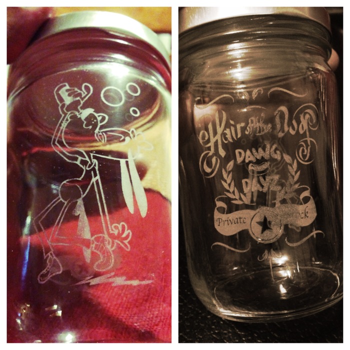 6 inch Laser etched glass Mason Jar. Great for storing things like pencils, erasers, etc. or just having a drink of your best private stock.