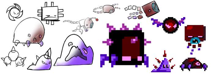 The game pays homage to the classics that we grew up loving, such as Super Mario Bros., Donkey Kong Country, Kid Icarus, and Legend of Zelda. And then we asked each other "Can you imagine defeating a huge 32-bit boss as a single pixel or even as an 8-bit character?"