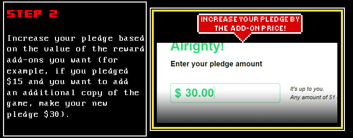 Add-Ons are rewards that you can purchase by adding to your existing pledge! The way that you add these rewards is increasing your current pledge amount by the price of the add-on you want to purchase (see below). At the end of the Kickstarter, we will send out a survey asking everyone if they selected any add-ons and reselecting what you've selected.