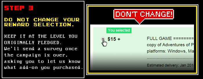 That's why we need you! You, the backers, play a major role in the development of Adventures of Pip. You are the Bit Steam that gives life to Adventures of Pip. Thank you so much for your support and pledges!