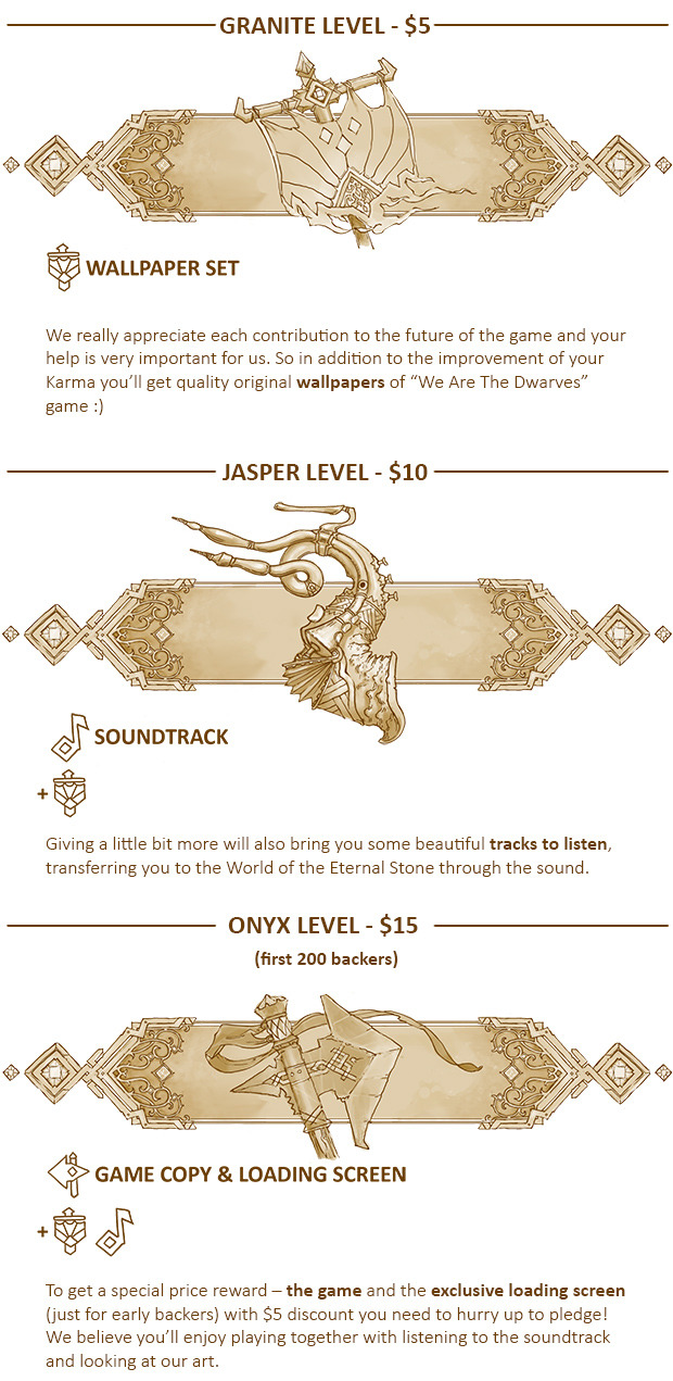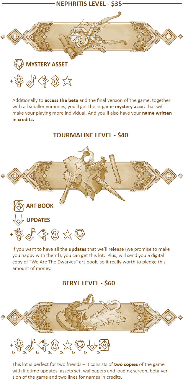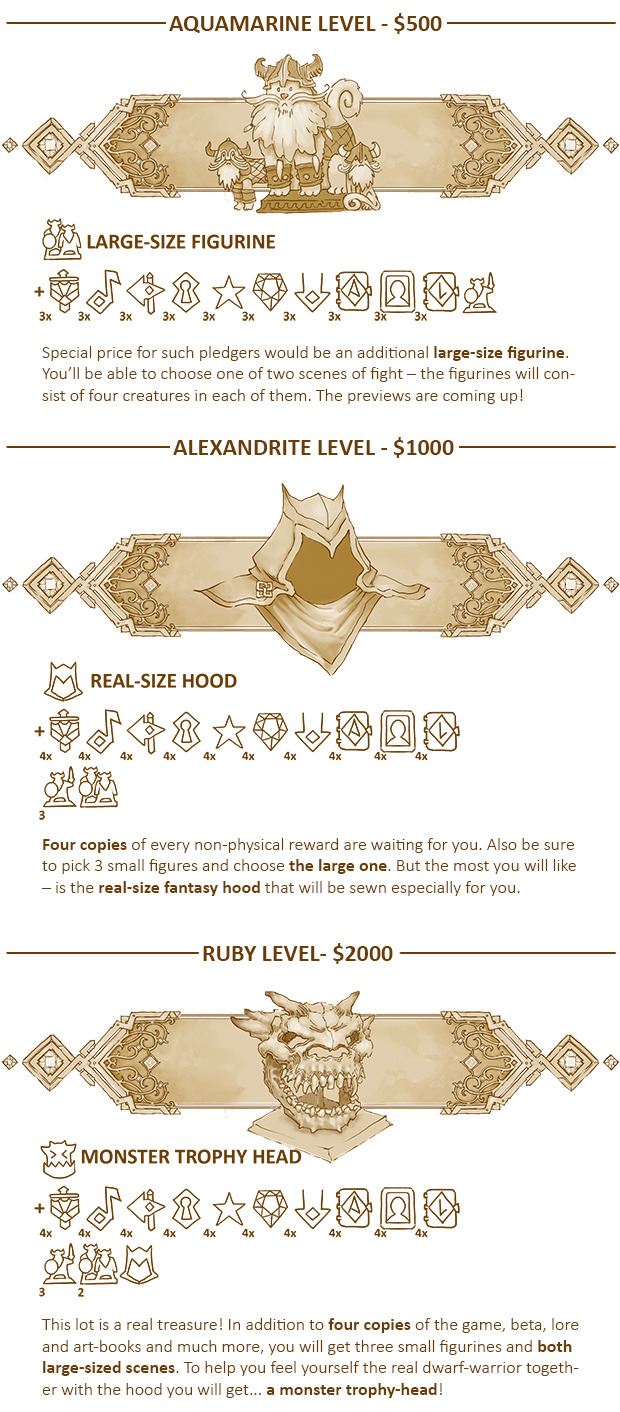 ADAMANT LEVEL -- Fantastic trip to our studio, real steel and wood dwarven shield, underground monster stuffed head, exclusive dwarven hood, 5 figurines of choice (small), 2 figurines of choice (large) + (X4 for everything) The Game DRM Free digital copy, portrait in Gallery of Ancestors, lore book, lifetime free updates, exclusive backers asset set, beta-test access, name in credits, digital copy, backer loading screen, wallpaper, soundtrack.