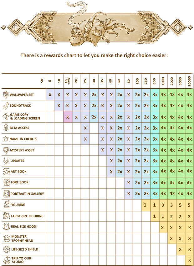 OPAL LEVEL -- Figurine of choice (small), + (X2 for everything) The Game DRM Free digital copy, portrait in Gallery of Ancestors, lore book, lifetime free updates, digital art book, exclusive backers asset set, beta-test access, name in credits, backer loading screen, wallpaper, soundtrack.